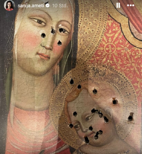 Rappel des faits, tels que BV vous les avait révélés en septembre 2024. Sanija Ameti avait publié sur les réseaux sociaux une vidéo où elle tirait sur la reproduction d’une Vierge à l’Enfant, signée Tommaso del Mazza (XIVe siècle). Face au mécontentement suscité, elle expliquait avoir tiré sur ce catalogue sans avoir prêté attention à la peinture elle-même. Ce que démentait largement la vingtaine d’impacts en pleine tête de la Vierge et de l’Enfant. Mieux que Thomas Matthew Crooks, qui toucha Trump à l’oreille, et aussi efficace que Tyler Robinson, qui tua Charlie Kirk.
